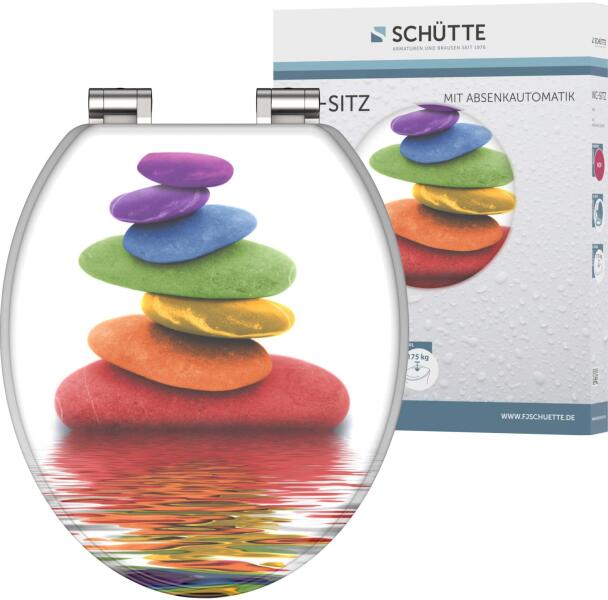 A leeresztő automatikával ellátott, kiváló minőségű Eisl Colorful Stones Holzkern WC-ülőke normál méretű, és szinte az összes kereskedelemben kapható WC-csészéhez alkalmas. A csendes leeresztő rendszernek köszönhetően kellemetlen zajok nélkül csukhatja le a fedelet és az ülést. Ez a strapabíró Holzkern anyagból készült WC-ülőke törésbiztos és karcálló, így hosszú élettartamú. A zárt pórusú felület egyszerű és higiénikus tisztítást tesz lehetővé. Az Eisl WC-ülőkét gyerekjáték összeszerelni, és szerelésre készen, rögzítőanyaggal együtt kerül kiszállításra. Állítható rögzítési technológiával rendelkezik, amely különböző módokon történő szerelést tesz lehetővé. Termékjellemzők: - Szín: három oldalon nyomott minta - Tömeg: kb. 2770 g Méretek (Ma x Sz x Mé): kb. 45 cm x 37,5 cm x 5,5 cm