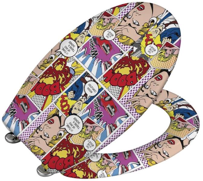 Stílusos WC-ülőke eredeti pop-art dizájnnal. Antibakteriális, strapabíró duroplastból készült. Easy-Close mechanizmus a csendes, lassú lecsukódáshoz. Biztonságos használat a kéz és ruházat becsípődése elleni védelemmel. Gyors és higiénikus felszerelés az 1 gombos Fix-Clip rendszerrel, rozsdamentes acélból. Egyszerű leszerelés a kényelmes tisztításhoz. Kiegészítő gumibetét megakadályozza az ülőke akaratlan elcsúszását. Kiválóan ellenáll a karcoknak, repedéseknek és a cigarettából származó hőnek. Ideális otthoni fürdőszobákba és forgalmas nyilvános helyekre egyaránt. Higiénikus, könnyen tisztítható felület. A fedél méretei: 38 × 45 cm, az ülőrész: 37,5 × 41,5 cm. Többszínű kivitel matt ezüst színű szerelékkel. Stabil és masszív szerkezet megfelelő teherbírással és hosszú élettartammal. Falra szerelhető ütköző a fokozott védelemért. Hosszabbított, 3 év garancia a nyugalomért és megbízhatóságért.